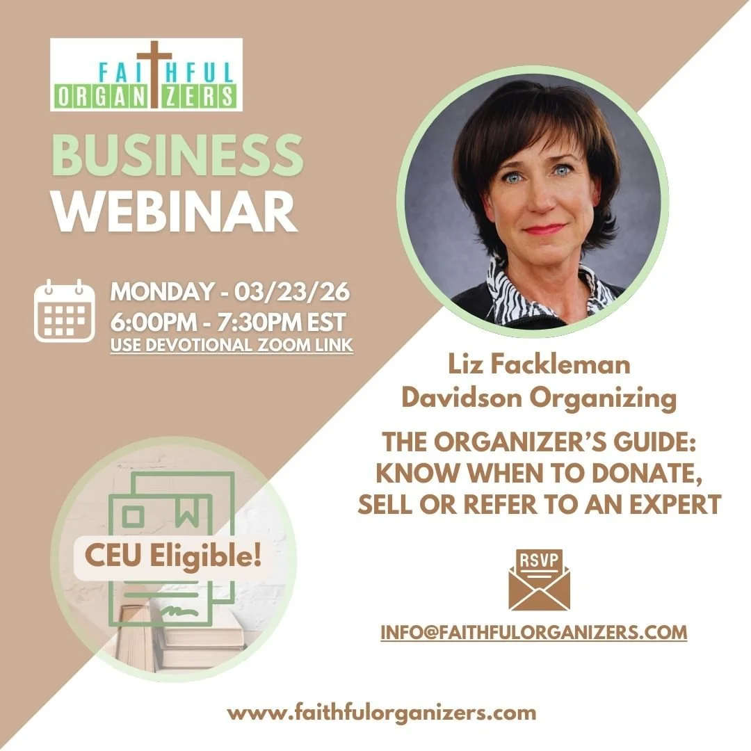 Monday, March 23, 6:00pm EST: The Organizer’s Guide to Value: Donate, Sell, or Refer to an Expert—Knowing the Difference with Faithful Organizers’ own Liz Fackelman of Davidson Organizing